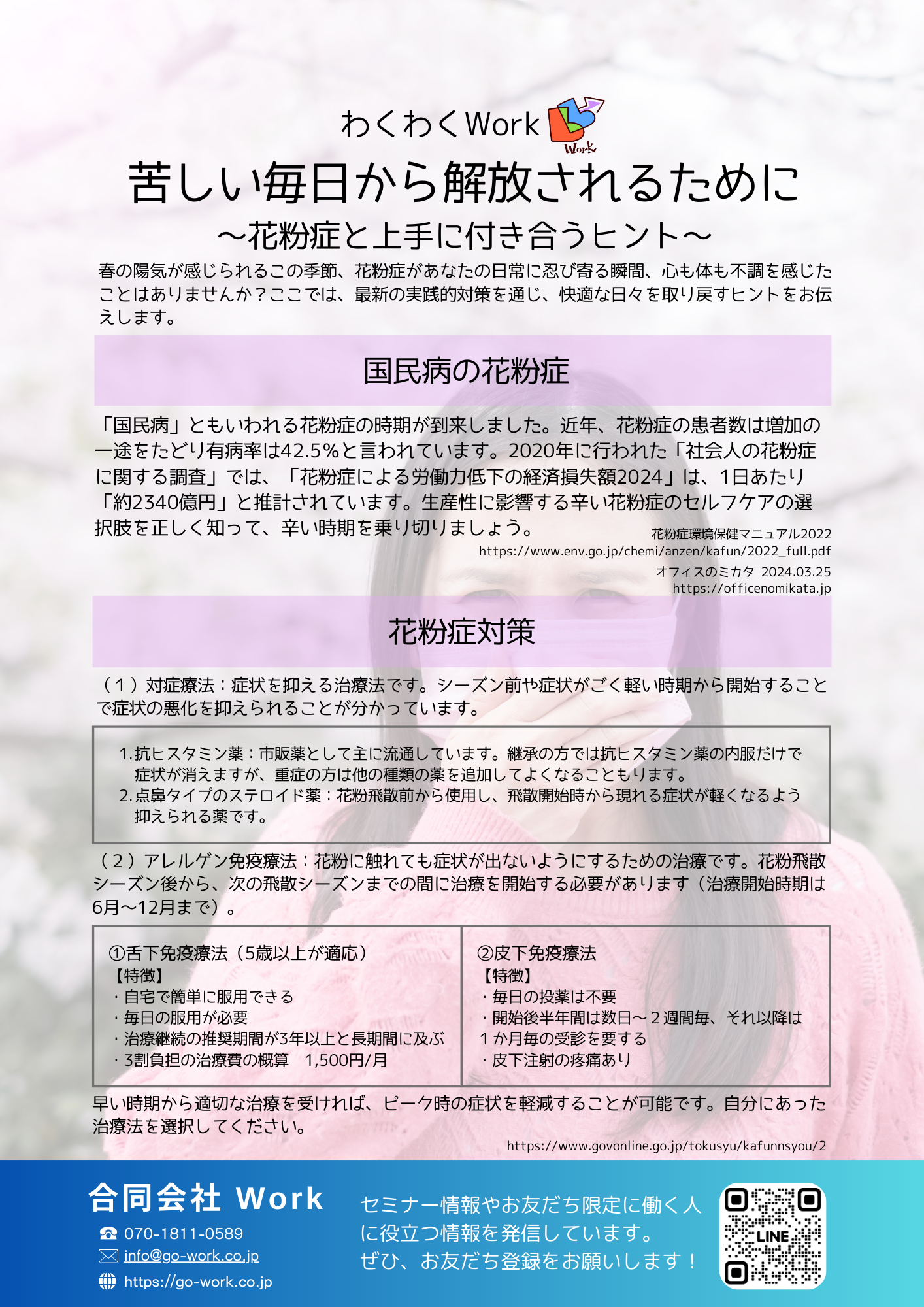 今回の「わくわくWork」では、花粉症の基礎知識に加え、症状を軽くするための対策と治療の選び方を1枚にまとめました。